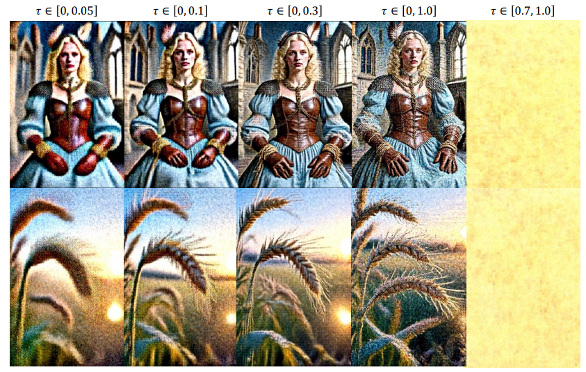 当$\tau$被限制在高噪声区域时,单步生成器的结果显示CFG Aug.贡献了大致的轮廓。而随着区间逐渐往低噪声区域扩展,更多的细节显示了出来。而当跳过高噪声区域,直接在低噪声区域进行CFG Aug.,训练崩坏。这个现象说明高噪声区域的CFG Aug.支撑了低频结构,低噪声区域的CFG Aug.增添了高频细节。所以作者指出应该在$\tau > t$的区间下做CFG Aug.。因为在$t$时的$z_t$已经有了一些相比于$t$强度的噪声更清晰的低频结构,而我们希望CFG Aug.在这个基础上聚焦于那些没有被解决的部分,即$\tau>t$的那部分。