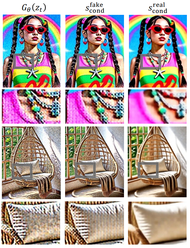 这时$G_\theta$的结果有一些棋盘伪影,$s^\mathrm{fake}$也有,但$s^\mathrm{real}$没有。这说明如果在训练时启用$s^\mathrm{real}-s^\mathrm{fake}$,就能自然得到一个消去伪影的方向,这说明DMD Loss确实起到了正则化的效果。