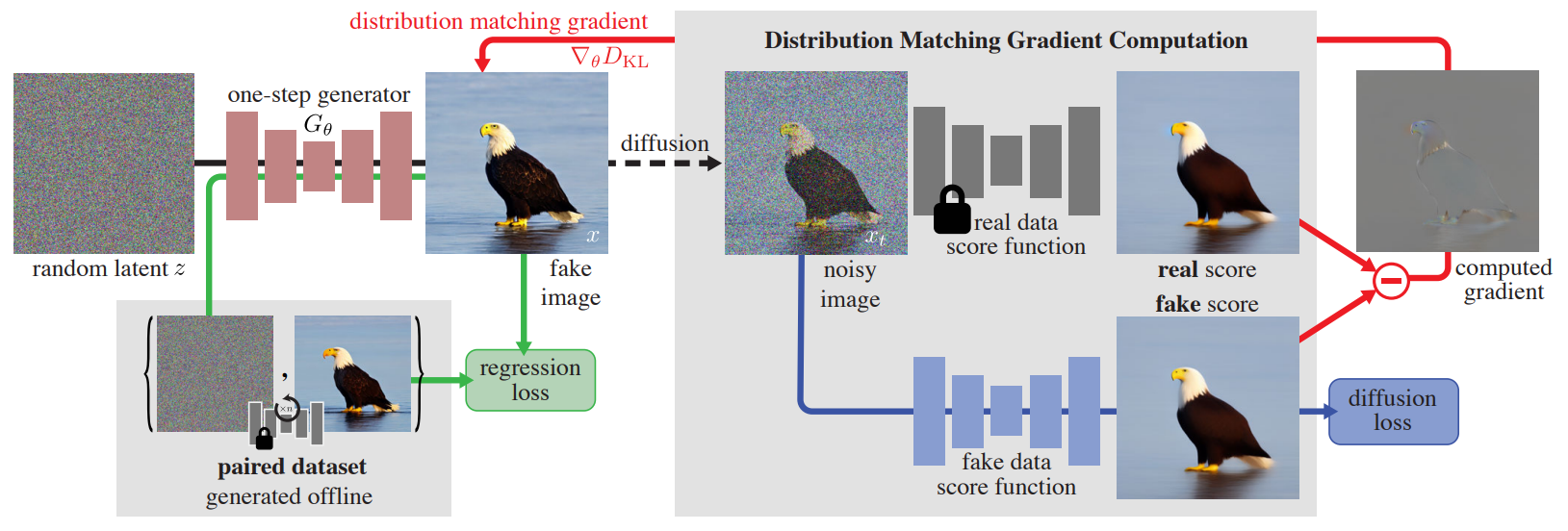 这个部分是想学习Distribution Matching Distillation系列的工作(DMD,DMD2,Decoupled DMD,DMDR),其中最后的DMDR是最近的一个文本生成图像模型—Z-image能大放异彩的重要设计。但故事的一开始,要先回忆一段往事: