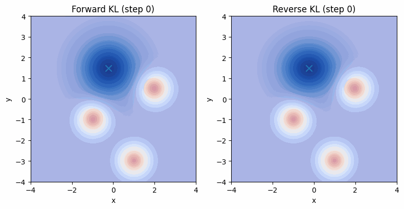 为了更好的理解前向KL和反向KL以及他们对应的行为,我们可以利用torch的自动微分,设定一个可学习的单峰高斯分布作为$q(x)$,然后以一个多峰高斯分布作为$p(x)$。我们可以可视化一下优化时的行为: